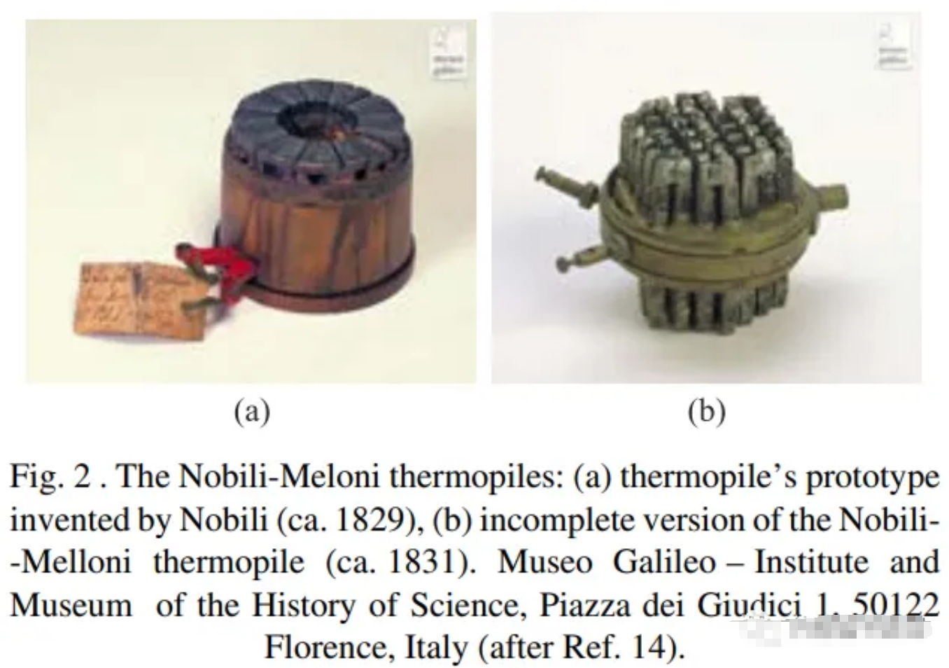 1831年后,M. Melloni 提出了将多个铋铜热电偶串联连接的想法,从⽽产⽣更⾼的、可测量的输出,多个热电偶连接称为热电堆,这是世界上第一个热电堆温度传感器。